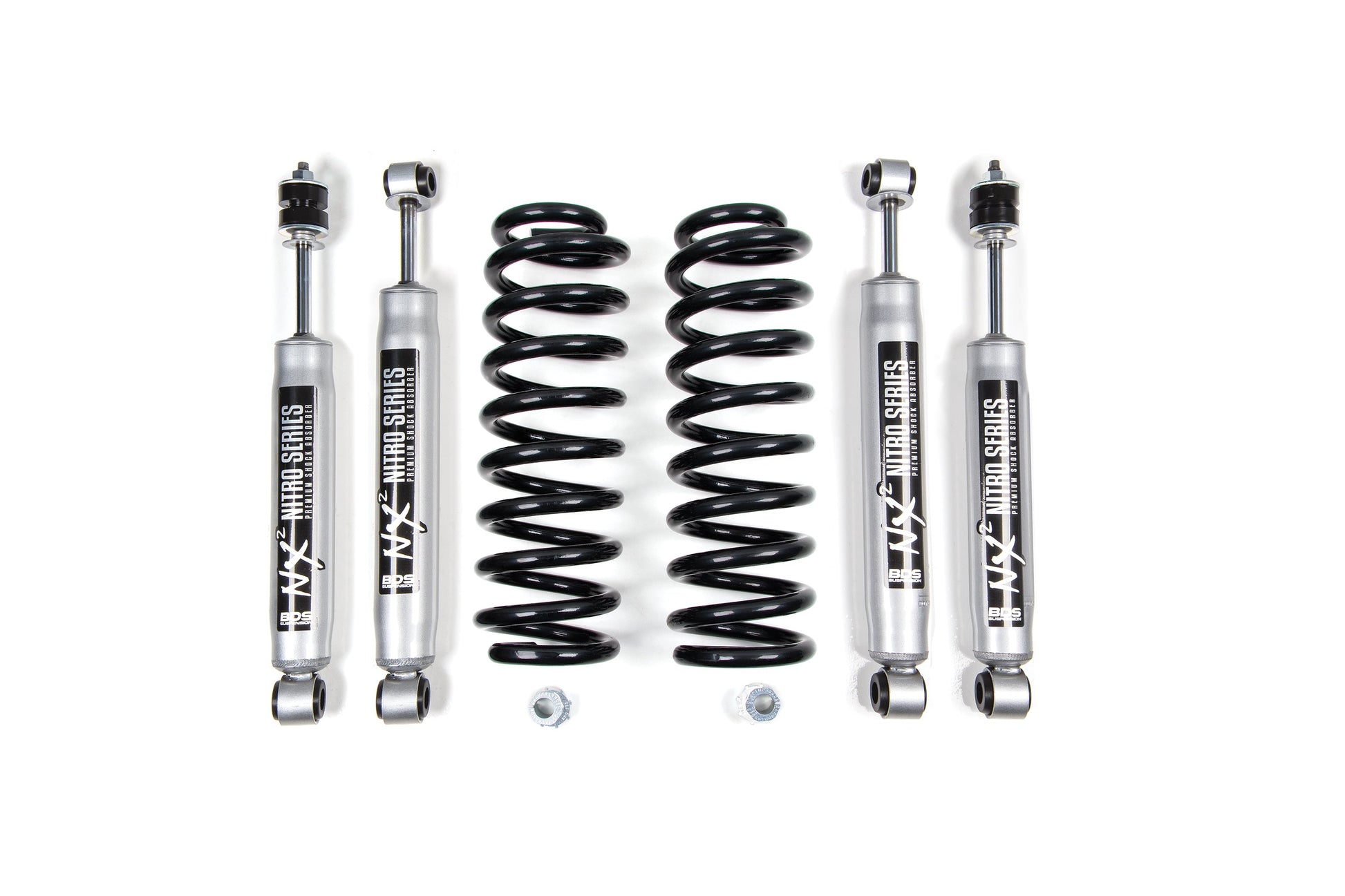 Up front, the lift kit includes Pro-Ride coil springs, adjustable alignment cams, and custom-tuned nitrogen-charged shocks. In the rear, this kit utilizes a matching set of NX2 Nitro shocks.