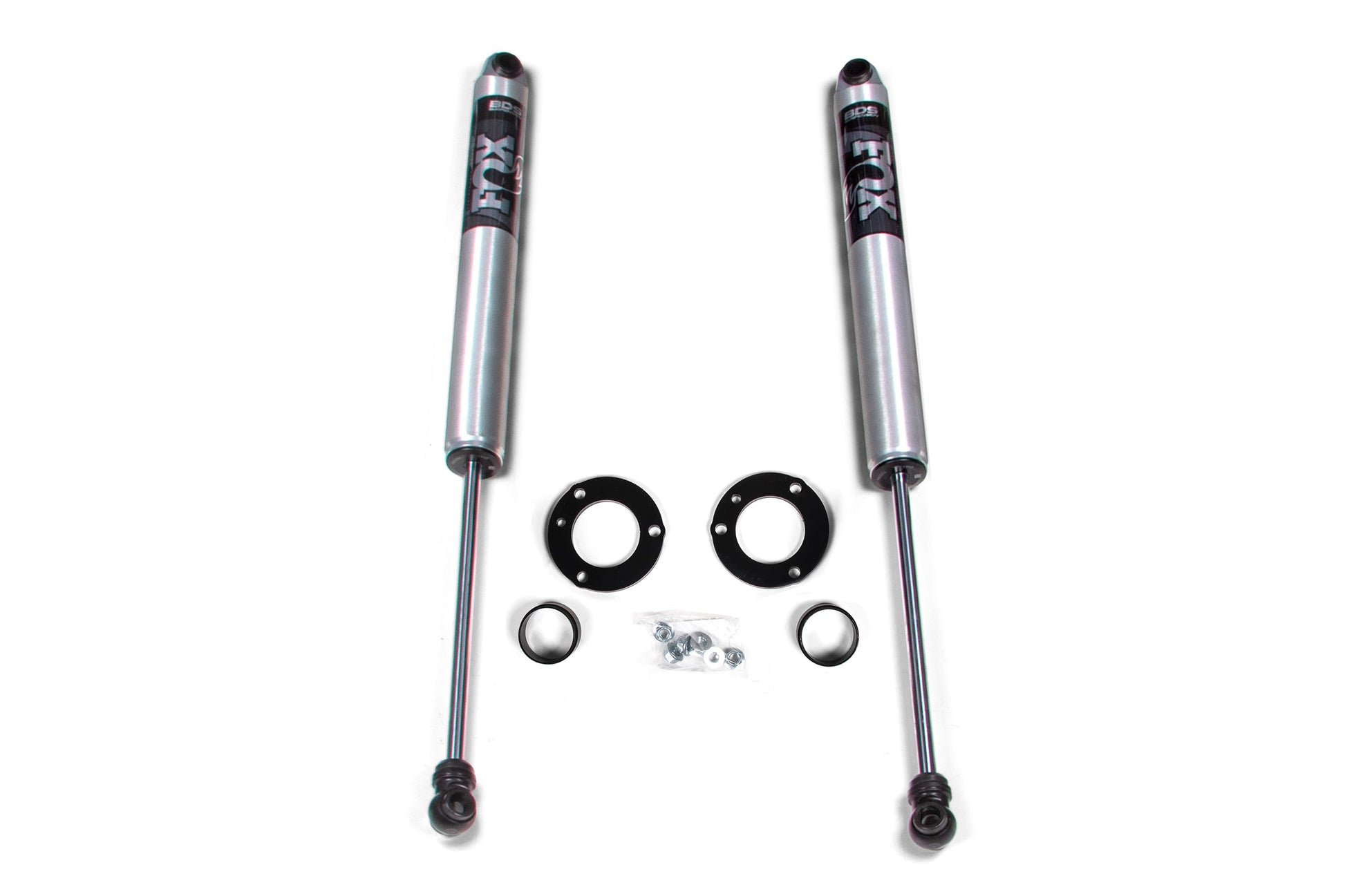 The lift kit includes steel top mount strut spacers, pre-load spacer and custom-tuned NX2 Nitro or FOX Performance series shocks. Give your new Ranger the extra boost with this 2" leveling kit from BDS Suspension.
