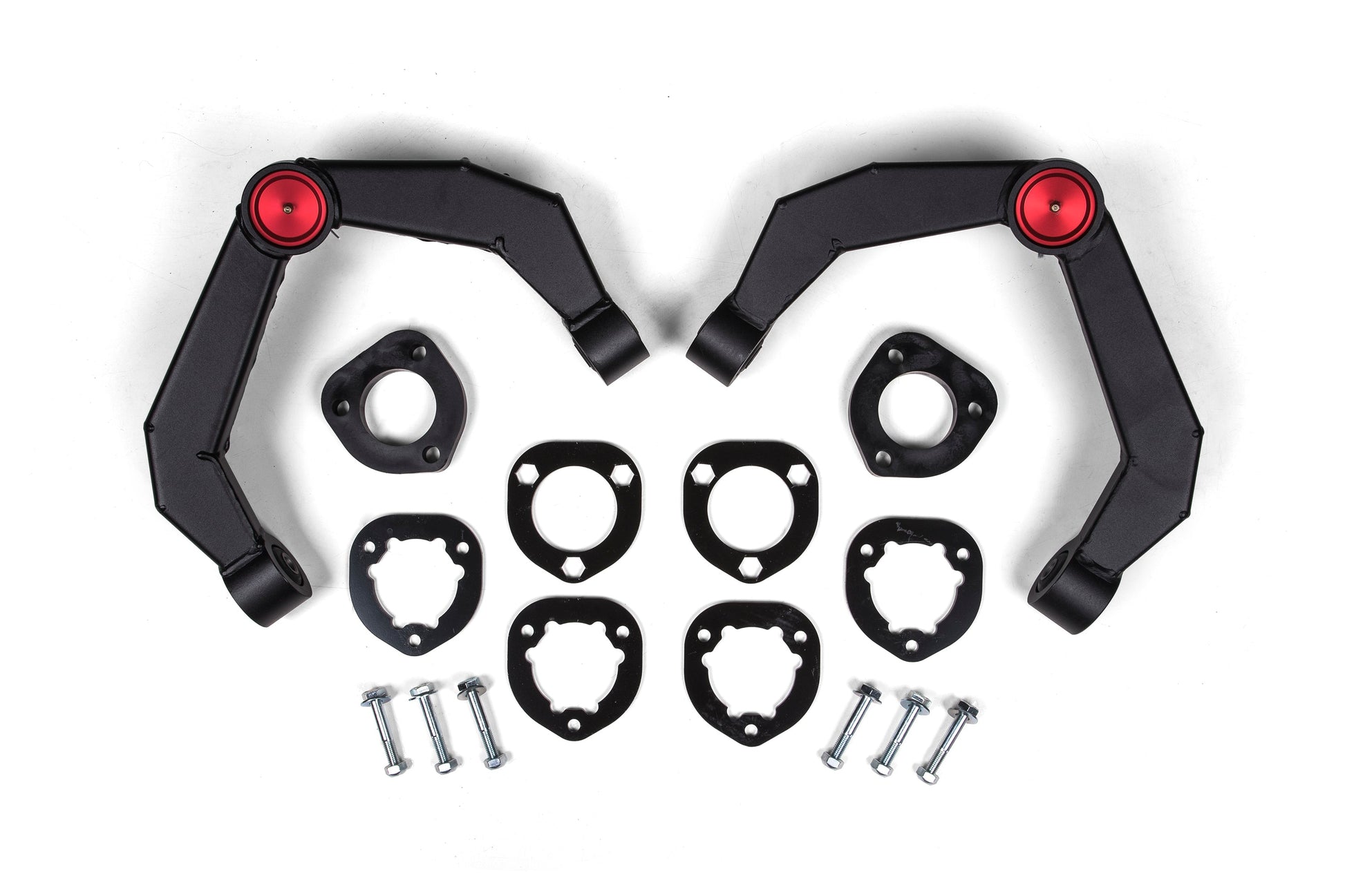 Level out your RAM 1500 the right way with Zone Offroad. In addition to these steel fabricated top mounted strut spacers designed for 2" of lift, these kits address the limitations of the factory upper ball joint (maxed out with a leveling kit installed which will lead to premature wear) by upgrading to adventure series upper control arms (UCAs). These fully boxed and welded UCAs offer superior strength and performance and use an indexed ball joint cup designed for more droop travel. Parts come fully assembled and ready to install right out of the box to allow clearance for 33" tires.