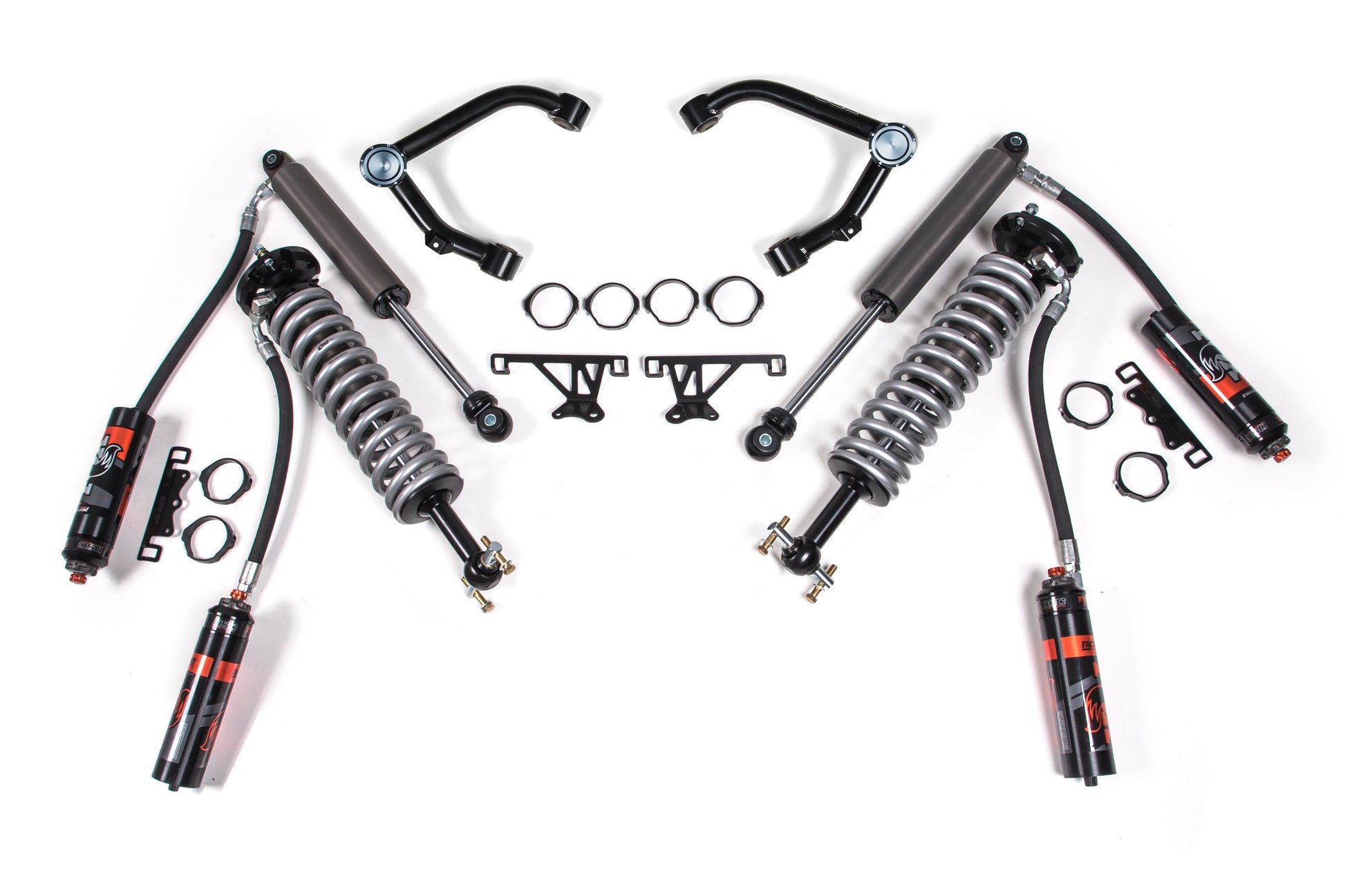 Up front, the lift kit includes FOX 2.5 Factory Series remote reservoir coilover shocks and heavy-duty tubular upper control arms for increased strength. In the rear, this kit utilizes a complementary set of FOX 2.0 Performance shocks for the smoothest ride.