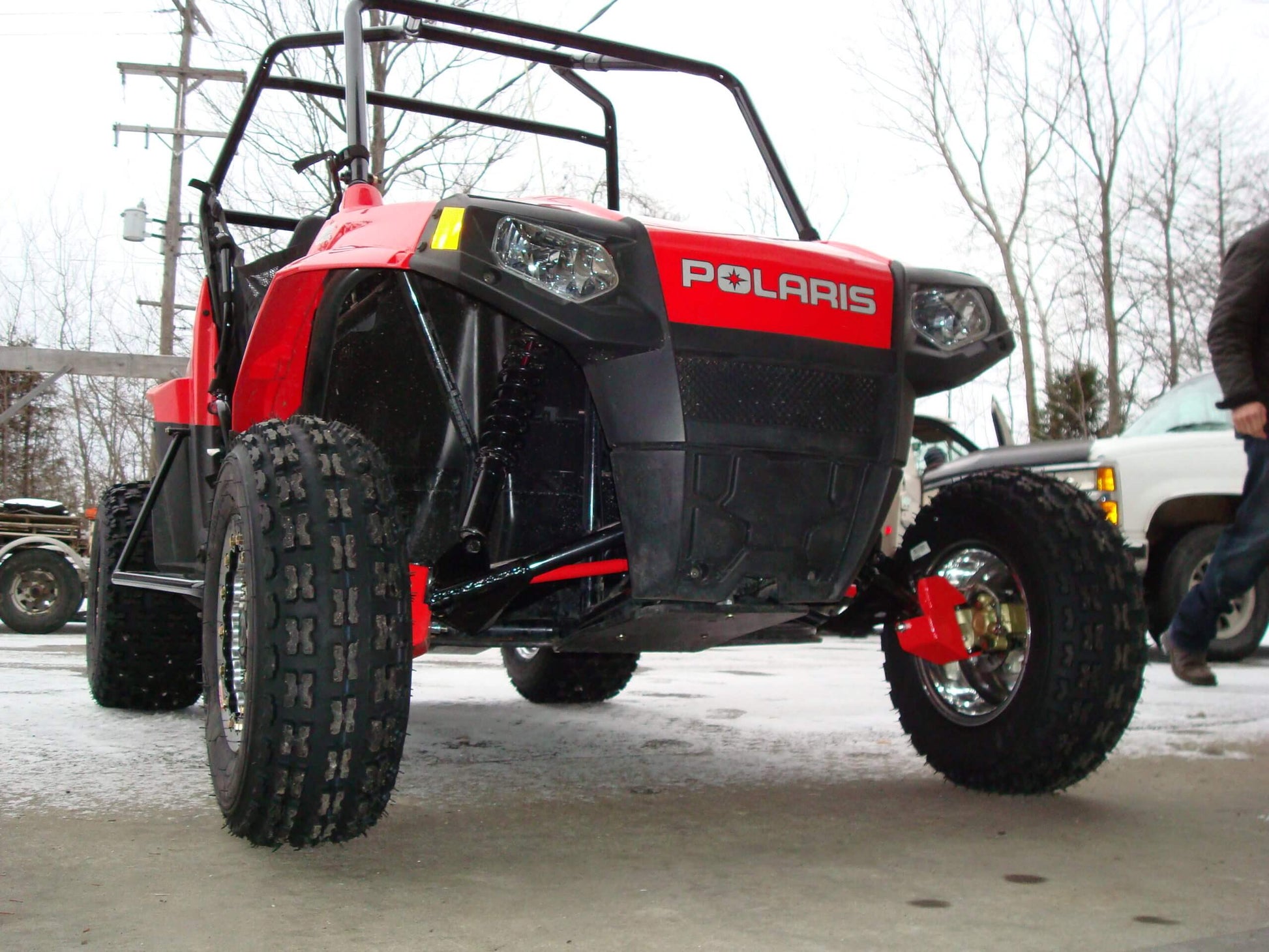 The RT Pro RZR 170 Lift Kit uses a combination of experience and knowledge to gain the needed ground clearance and improved handling characteristics the RZR 170 needs. We've relocated the rear upper shock mounts to manipulate the geometry of the rear end and relocated the front spindles while still using the stock front A-arms. By doing this, we've increased the ground clearance by two inches. The front kit is especially helpful for clearance because the arms stay at the same angle as stock while the spindle is lowered. This provides even better arm to ground clearance than other "arm replacement" alternatives because the arm is put up higher along with the chassis which means there is even less to hit or drag across the arms with the RT Pro kit.