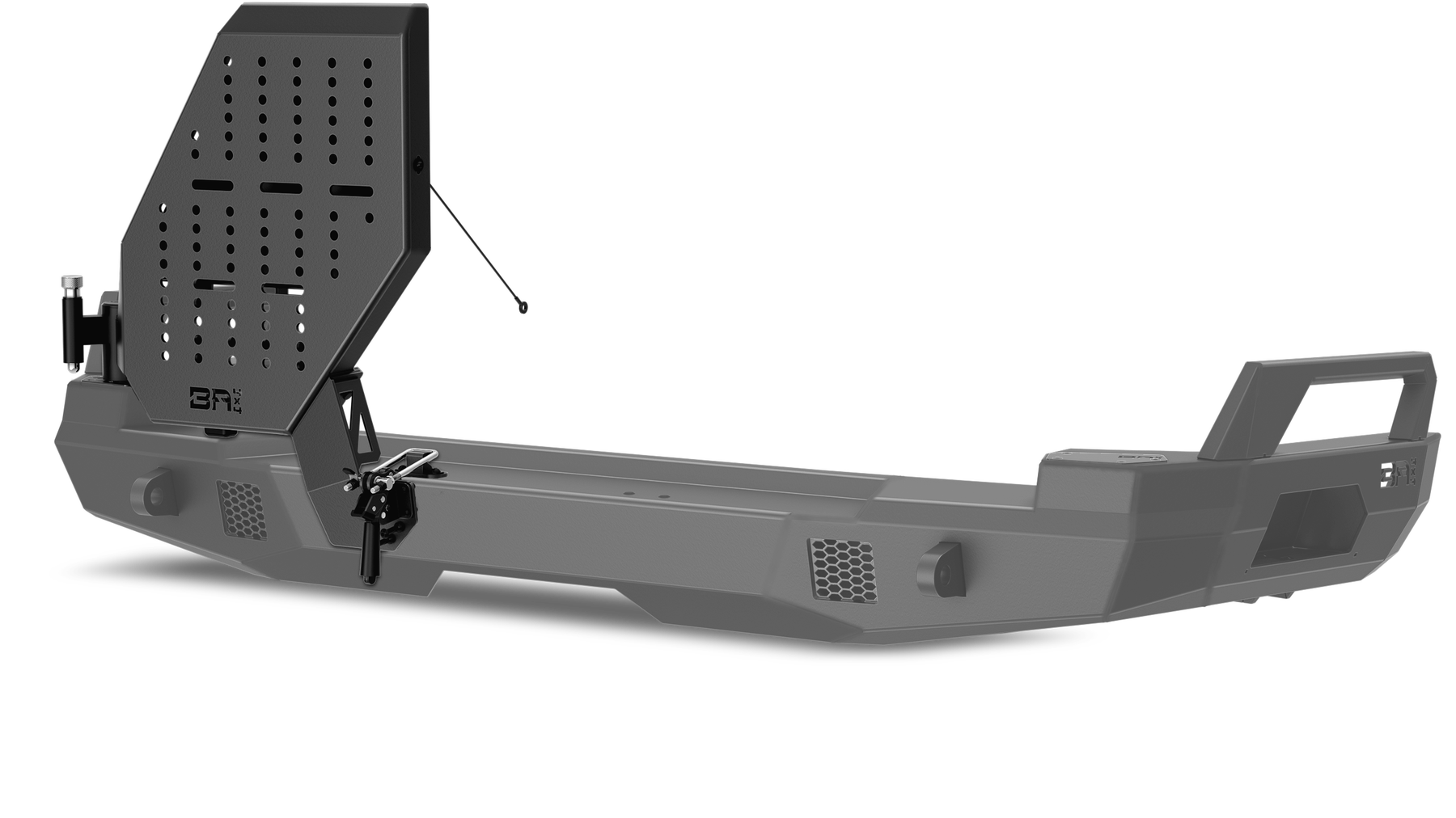 - Adaptable storage solution to mount almost anything (spare tire, jerry cans, tread boards, rotopax, hi-lift jack, storage cases, etc.)