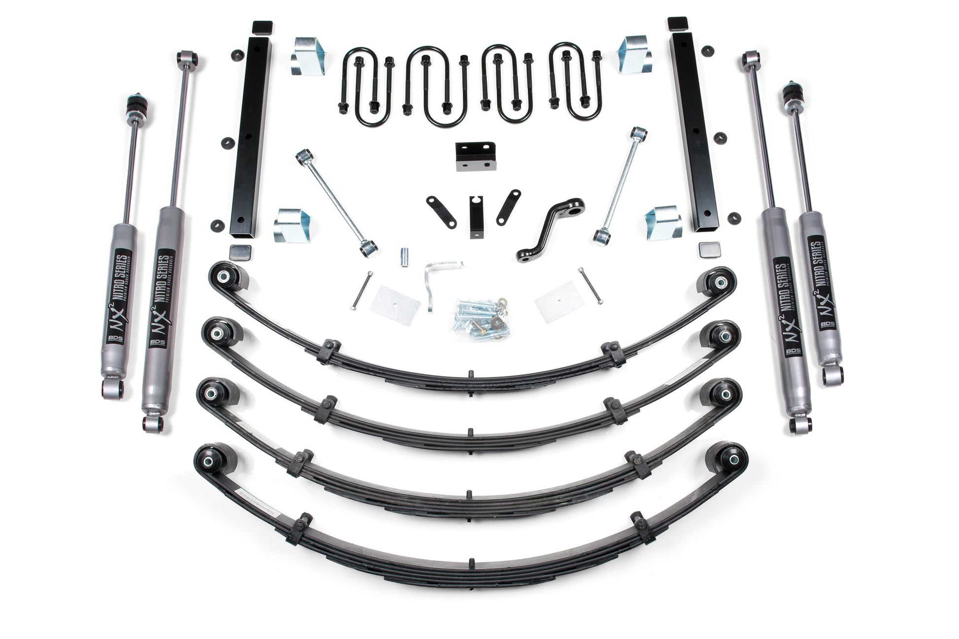 This 3.5-inch lift kit includes front and rear Glide-Ride leaf springs with new u-bolts, front and rear track bar relocation brackets to center the axle, brake line brackets, power steering pitman arm, bump stop extensions, and a transfer case drop kit to ease the drive line angles. Round out this kit with specially tuned NX2 nitro series gas shocks to offer improved damper performance.