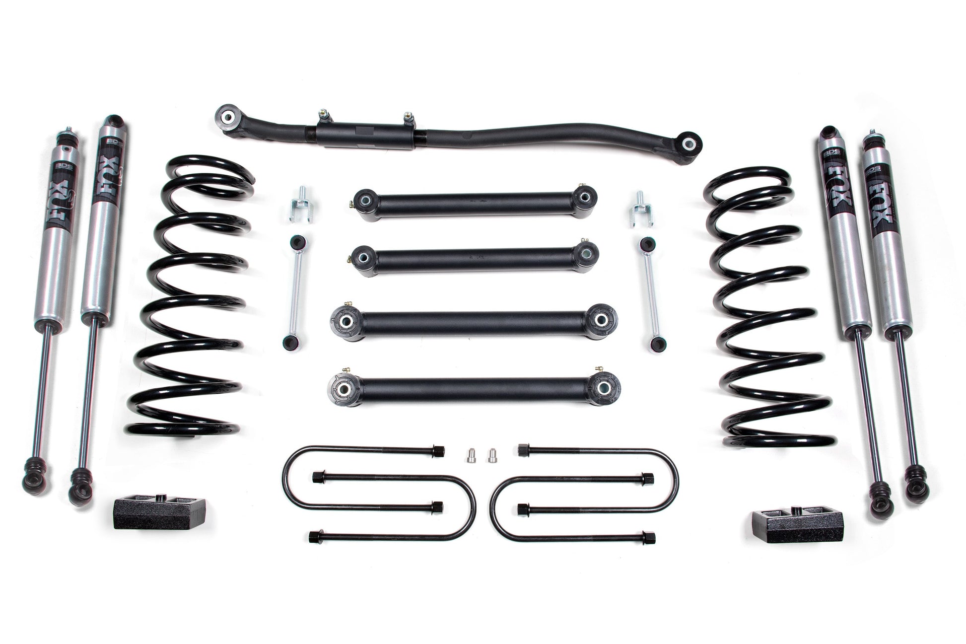 Up front the lift kit includes gas-specific Pro-Ride coil springs, heavy duty adjustable track bar, fixed length tubular upper and lower control arms, fixed length sway bar links with stud eliminator, and precision tuned NX2 or FOX 2.0 nitrogen charged shocks. In the rear this kit utilizes heavy duty cast steel blocks, longer u-bolts, and a matching set of NX2 Nitro or FOX 2.0 Performance shocks.