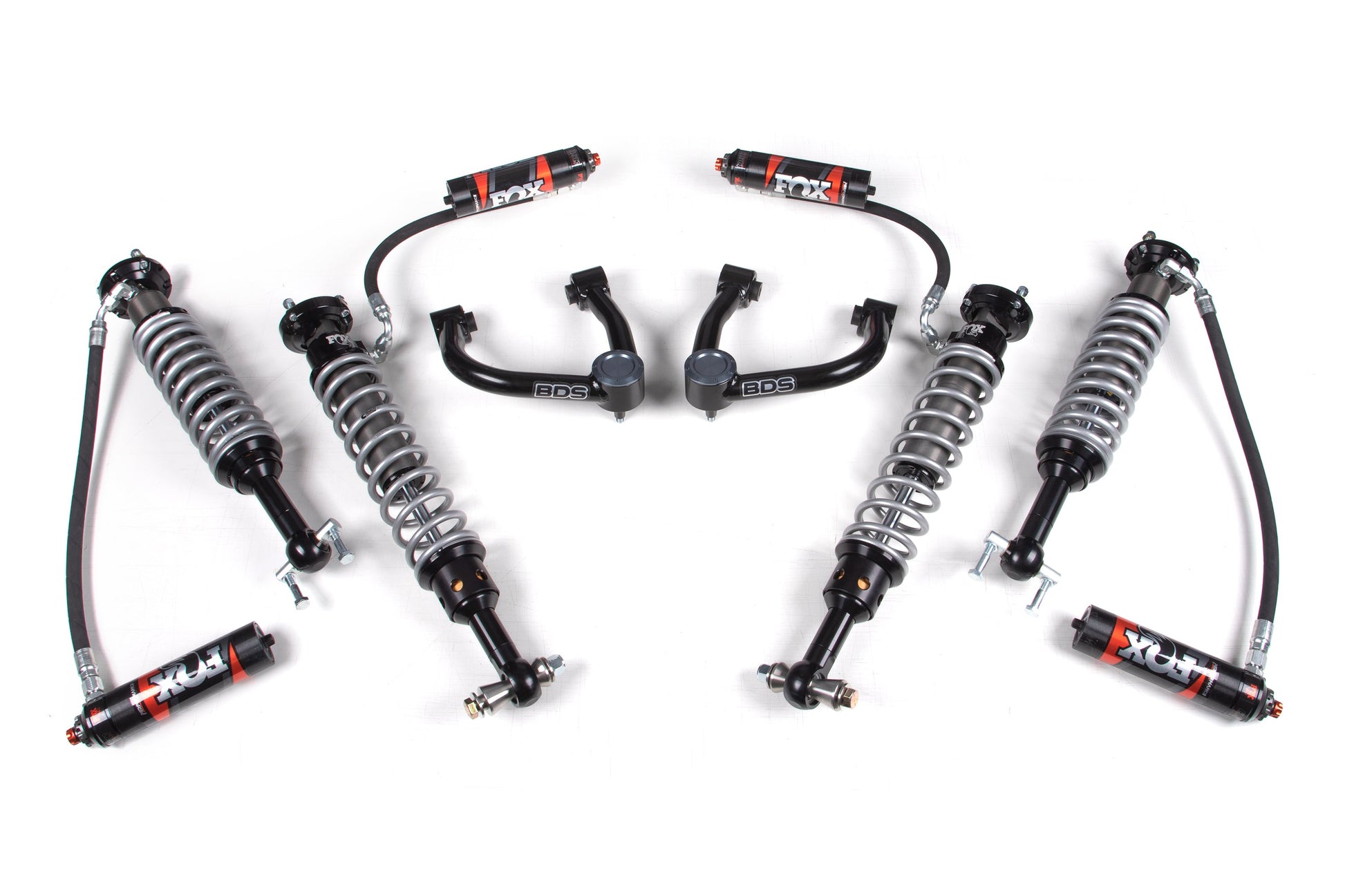 Up front the lift kit includes FOX 2.5 Performance Elite Series remote reservoir coil-over shocks and heavy duty tubular upper control arms for increased strength. In the rear, BDS utilizes a complementary set of FOX 2.5 Performance Elite coil-over shocks for an improved ride.