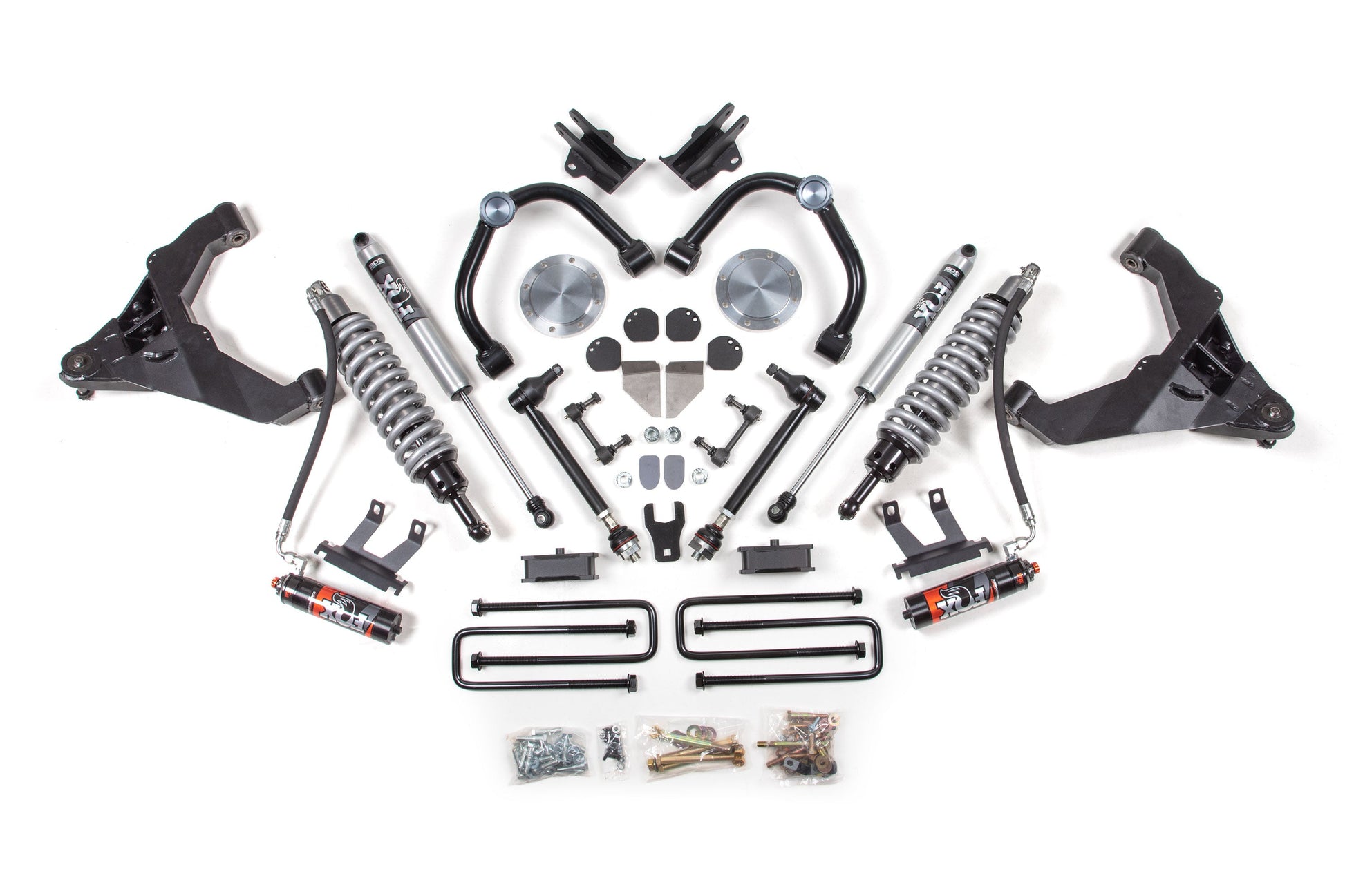 characteristics. Up front, the kit utilizes FOX 2.5 coil-over shocks, heavy duty tubular upper control arms, fully boxed and gusseted lower control arms, and multipiece differential relocation brackets