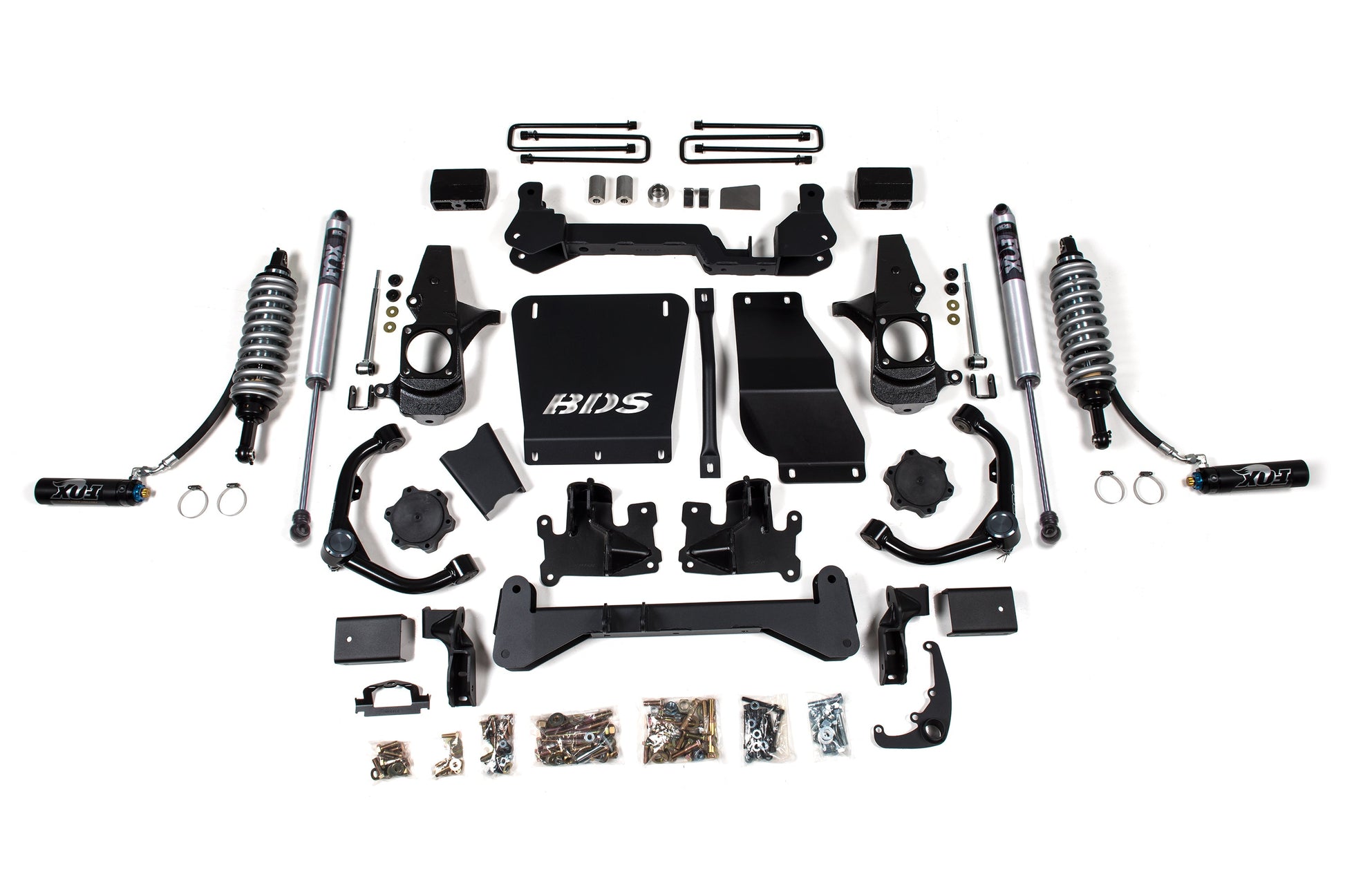 This kit takes advantage of BDS's tried and true high-clearance design for improved ground clearance, strength, and offroad protection while correcting suspension and steering geometry for great on-road handling characteristics. Up front, the kit utilizes FOX 2.5 coil-over shocks, heavy duty tubular upper control arms, high-arched 1/4-inch thick steel crossmembers along with a multipiece differential relocation brackets and heavy duty skid plates built for offroad protection. Steering geometry is corrected at the new taller ride height with CNC-machined ductile iron steering knuckles. These combined with the provided sway bar drops, bump stop extensions, brake line brackets, CV spacers, supplied hardware and more provide a comprehensive front suspension lift ready for whatever you throw at it.