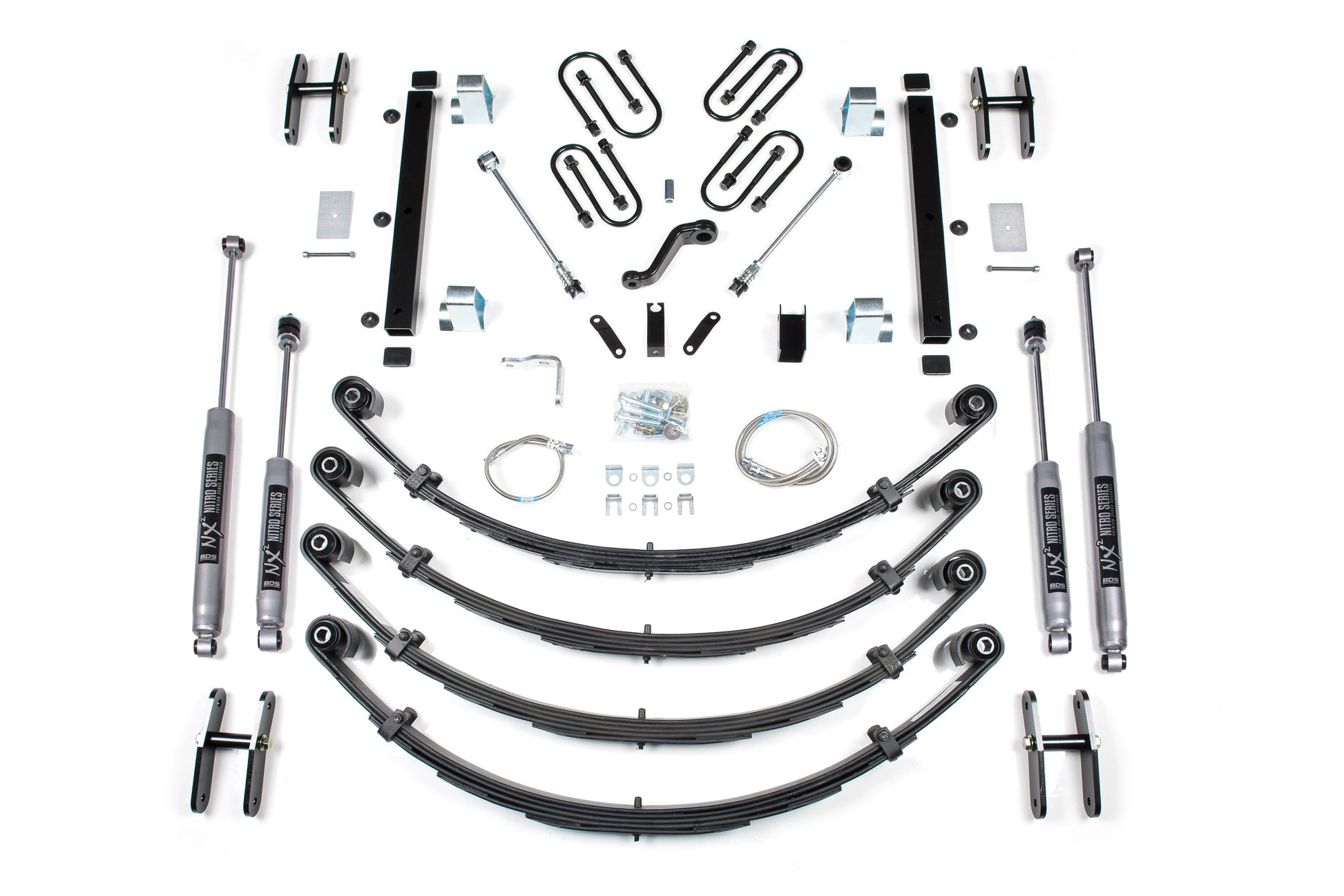 This 4.5-inch lift kit includes front and rear Glide-Ride leaf springs with new u-bolts, front and rear track bar relocation brackets to center the axle, stainless steel braided brake lines, sway bar disconnects, power steering pitman arm, bump stop extensions, a transfer case drop kit to ease the drive line angles and 1" extended shackles to let your springs really flex. Round out this kit with specially tuned NX2 nitro series gas shocks to offer improved damper performance.