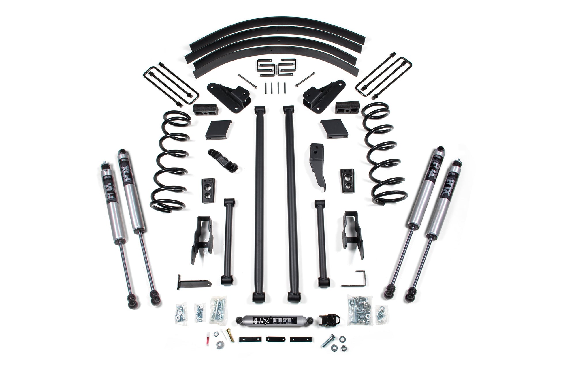 Up front the lift kit includes diesel-specific Pro-Ride coil springs, all four control arms plus mounting bracket, forged drop pitman arm and track bar bracket for steering correction, bump stops, sway bar drop brackets, and precision tuned NX2 or FOX 2.0 nitrogen charged shocks. In the rear this kit utilizes heavy duty cast steel blocks and add-a-leaf combo, longer u-bolts, and a matching set of NX2 Nitro or FOX 2.0 Performance shocks.