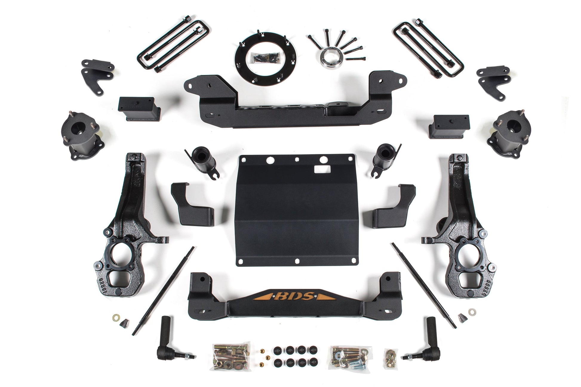 This kit takes advantage of BDS's tried and true high-clearance design for improved ground clearance, strength, and offroad protection while correcting suspension and steering geometry for great on-road handling characteristics. Up front, the kit utilizes top mounted strut spacers, high-arched 1/4-inch thick steel crossmembers along with a multipiece differential relocation brackets and heavy duty skid plates built for offroad protection. Steering geometry is corrected at the new taller ride height with CNC-machined ductile iron steering knuckles and replacement tie rod ends allowing for ESC system compatibility. These combined with the provided sway bar links, bump stop extensions, CV spacers, supplied hardware and more provide a comprehensive front suspension lift ready for whatever you throw at it.
