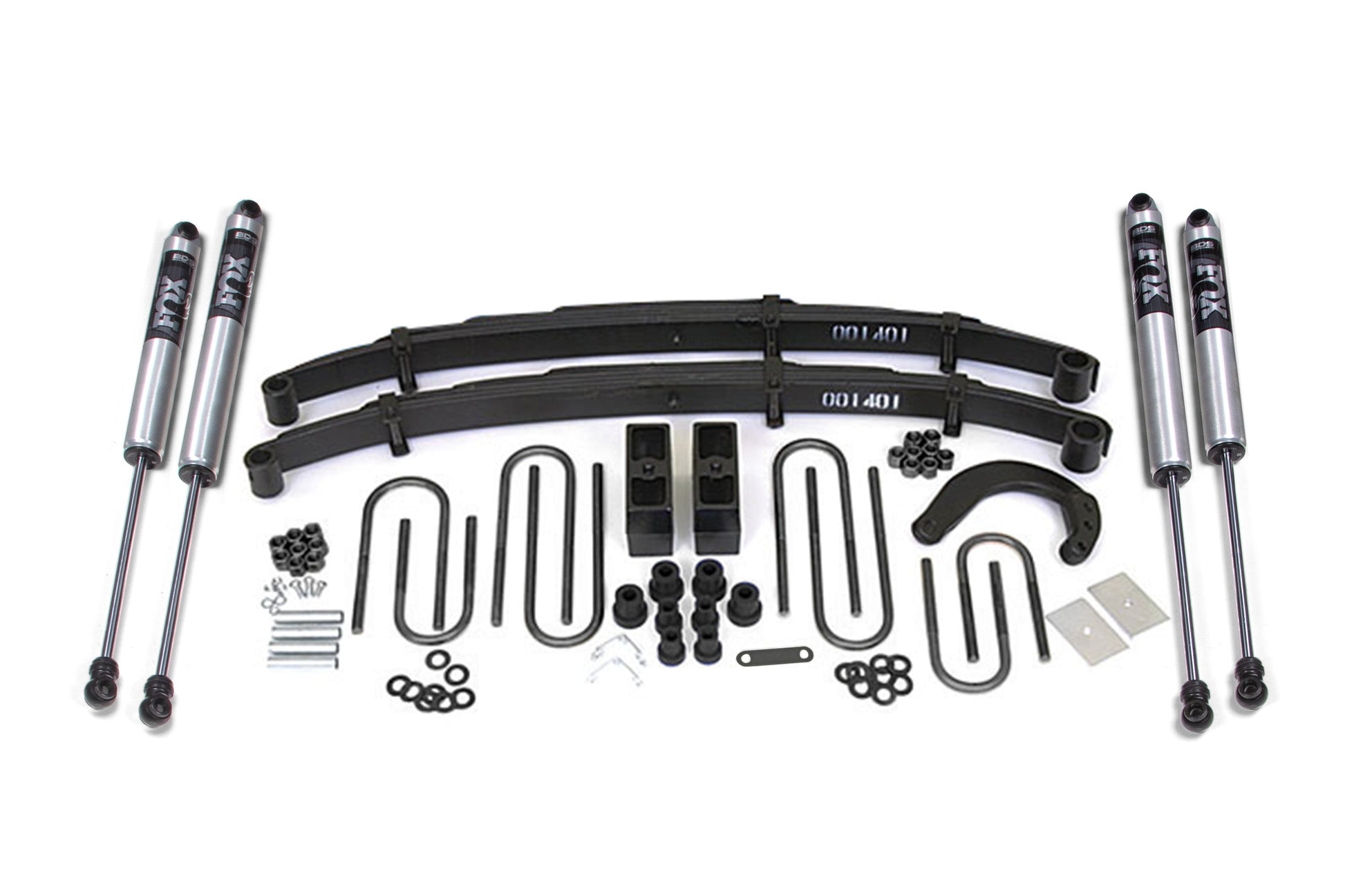 Up front the lift kit includes Glide-Ride leaf springs, 4" steering arm for steering correction, brake line brackets and precision tuned NX2 nitrogen charged shocks. In the rear this kit utilizes a high-strength lift block, longer u-bolts and a matching set of NX2 Nitro shocks.