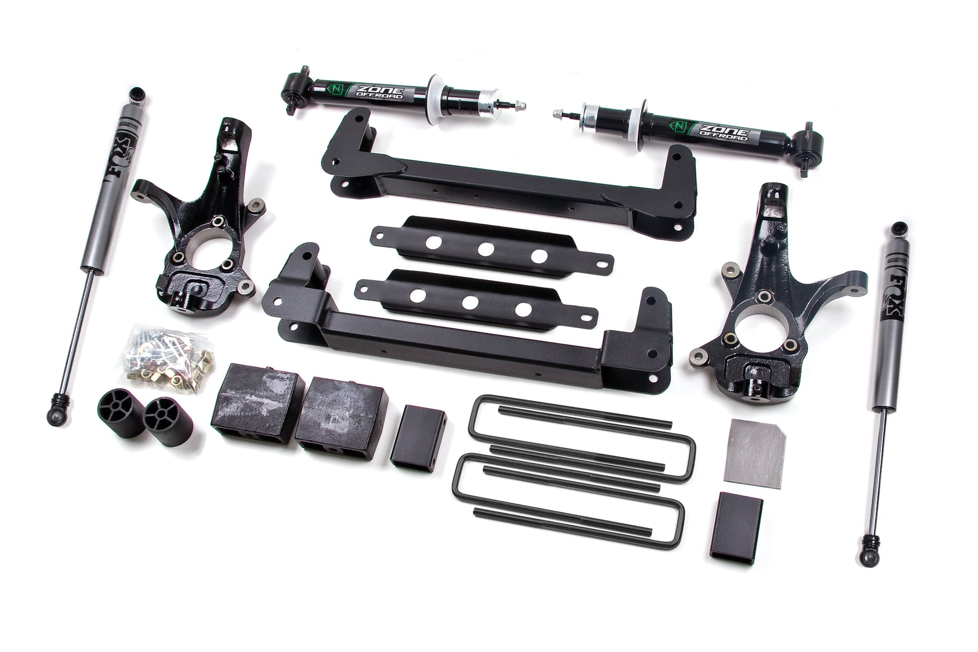Take your Silverado/Sierra 1500 to new heights with this 6.5" lift kit from Zone Offroad. Kits include everything needed from high strength crossmembers and steering knuckles to strut spacers and and rear block kit to level out the stance. Get the look, performance, and capability your truck deserves with clearance for up to 35" tires.