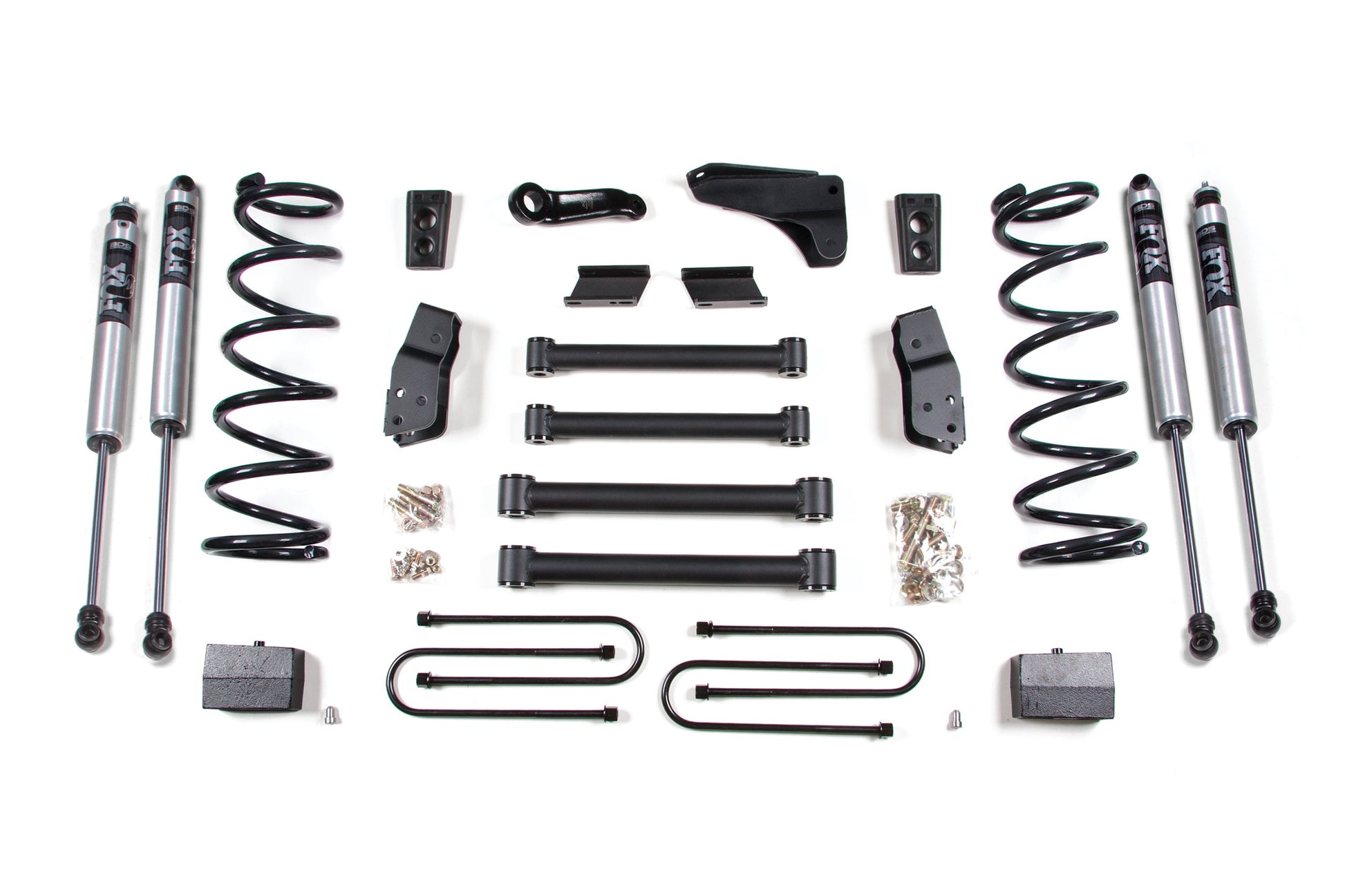 Up front the lift kit includes gas-specific Pro-Ride coil springs, all four control arms plus relocation bracket, forged drop pitman arm and track bar bracket for steering correction, bump stops, sway bar links, and precision tuned NX2 or FOX 2.0 nitrogen charged shocks. In the rear this kit utilizes heavy duty cast steel blocks, longer u-bolts, and a matching set of NX2 Nitro or FOX 2.0 Performance shocks.