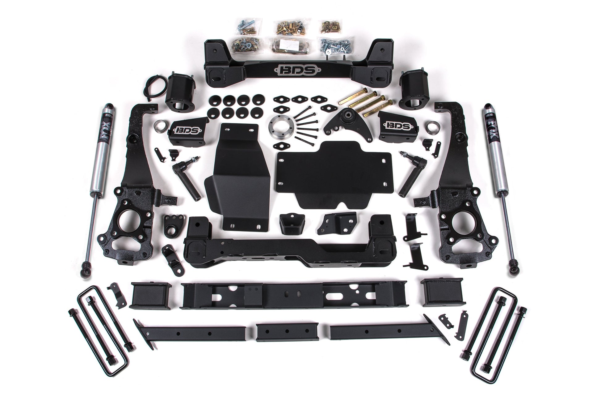 This kit takes advantage of BDS's tried and true high-clearance design for improved ground clearance, strength, and offroad protection while correcting suspension and steering geometry for great on-road handling characteristics. Up front the kit utilizes high-arched 1/4-inch thick steel crossmembers, top mounted strut spacers, multipiece differential relocation brackets and skidplate designed for offroad protection. Steering geometry is corrected at the new taller ride height with a pair of massive CNC-machined ductile iron steering knuckles. These combined with the provided sway bar relocation brackets, brake line brackets, alignment cam bolts, supplied hardware and more provide a comprehensive front suspension lift ready for use and abuse.