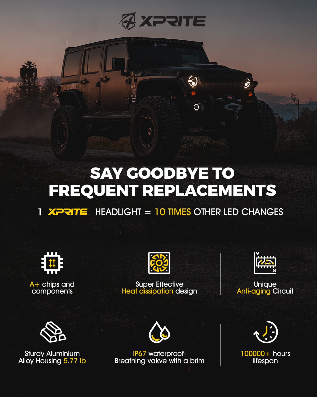 Experience superior illumination with our Wrangler headlights, boasting a clear "Z-shaped" line for glare-free visibility. Their unique anti-aging circuit and efficient heat dissipation ensure long-lasting brightness.