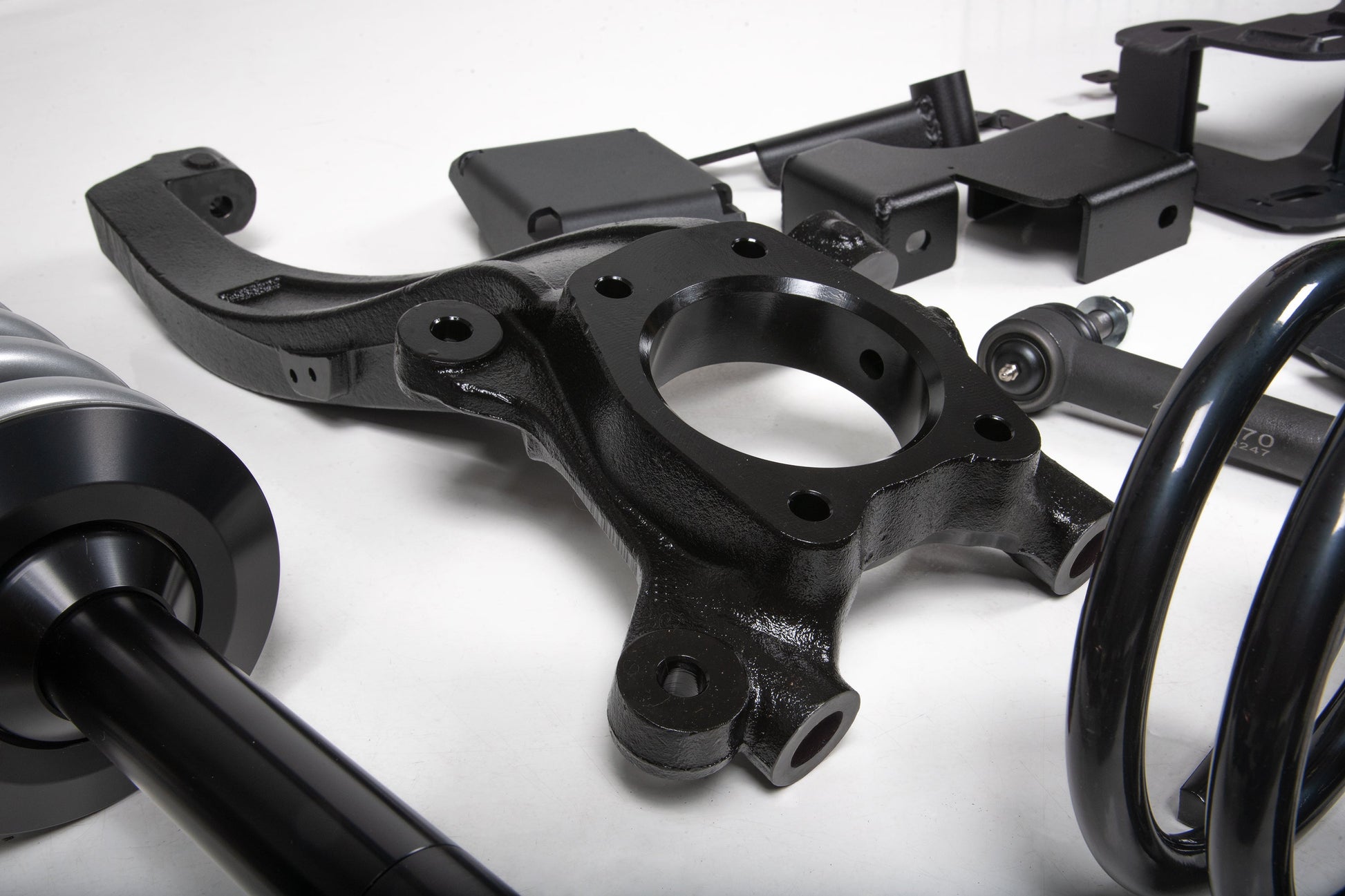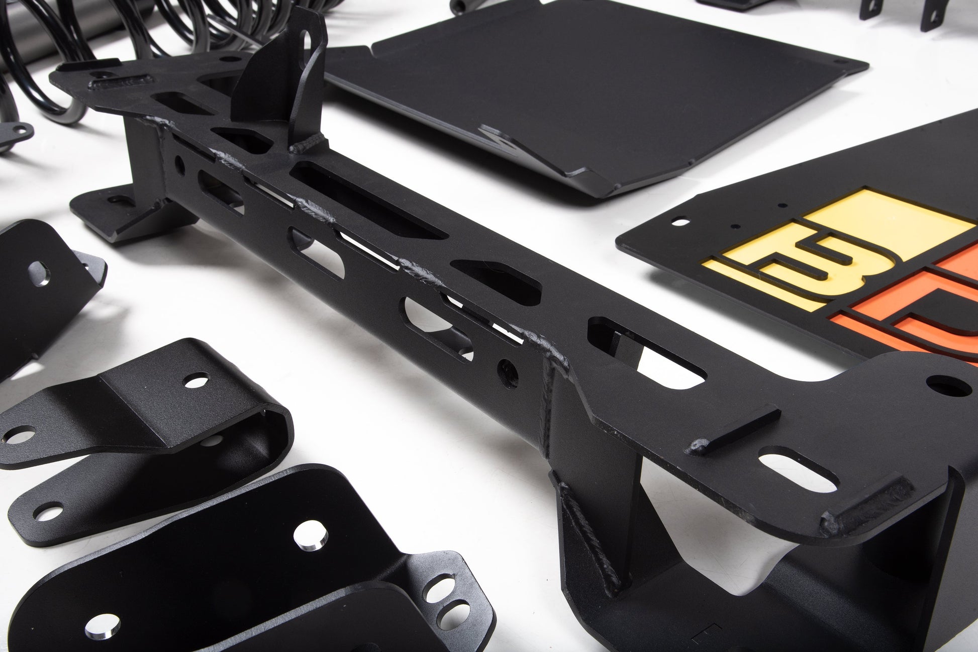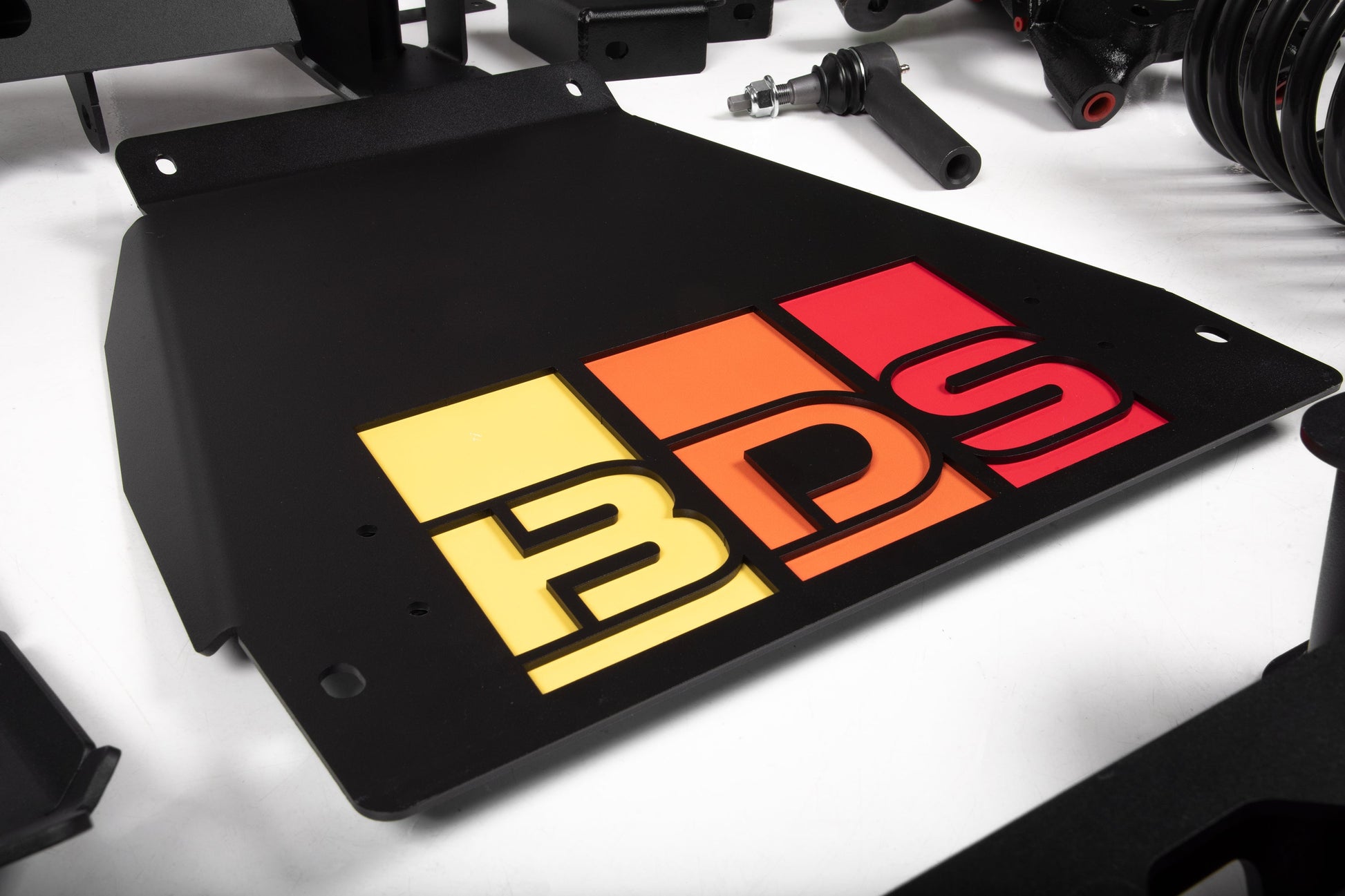 This kit takes advantage of BDS's proven high-clearance architecture for improved ground clearance, strength, and off-road protection, while correcting suspension and steering geometry for excellent on-road handling characteristics. Up front, the kit pairs the FOX 2.5 PE Coil-Overs with high-arched, 1/4-inch thick steel crossmembers, properly relocating the front differential to correct CV operating angles and protecting it with heavy-duty, laser-cut skid plates featuring the iconic tri-color stripe backing plate. Steering geometry is corrected at the new, taller ride height with CNC-machined ductile iron steering knuckles and high-strength tie rod ends, improving control and ESC system compatibility. These, along with the provided sway bar drops, bump stop extensions, brake line brackets, FOX reservoir mounts, and hardware packs, create a comprehensive front suspension lift ready for any challenge. In the rear, the kit utilizes a pair of ProRide coil springs, a track bar relocation bracket, extended sway bar links, and control arm brackets to lift and level the stance while maintaining suspension geometry and load capacity. For shocks, you have the option of FOX 2.0 IFP Performance Series gas shocks or an upgrade to the FOX 2.5 Performance Elite (PE) series piggyback reservoir shocks to match the front and further enhance vehicle performance and adjustability.