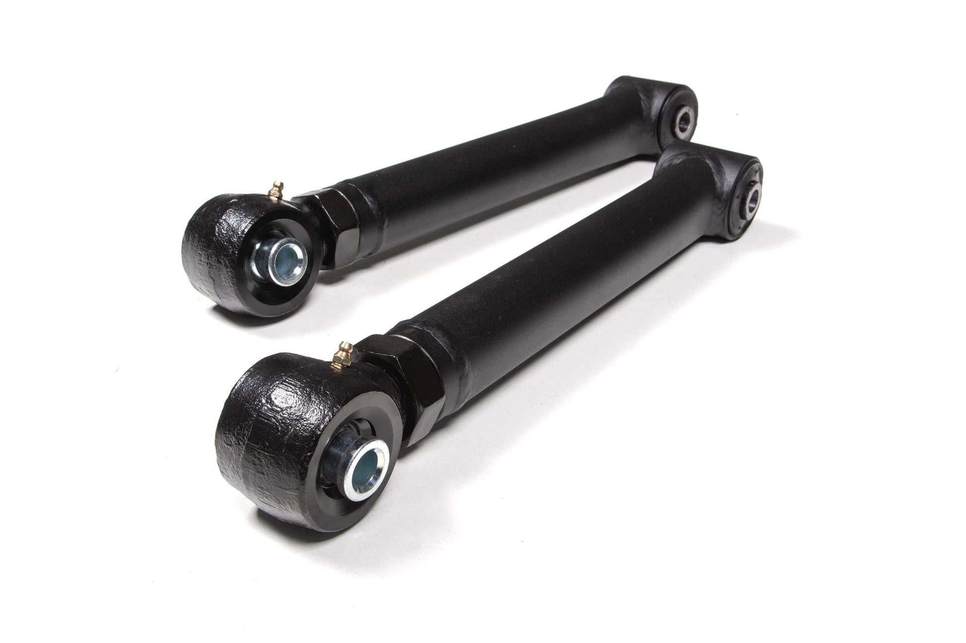 At the axle end they utilize an OE-style rubber bushing for long service-free operation and better isolation of noise, vibration, and harshness (NVH). At the frame mount they feature a large, forged flex end for strength, durability, and off-road articulation. The forged flex ends allow length adjustments to correctly position the rear axle and correct caster. Capable of 15-degrees of misalignment in either direction for more flex out on the trail.