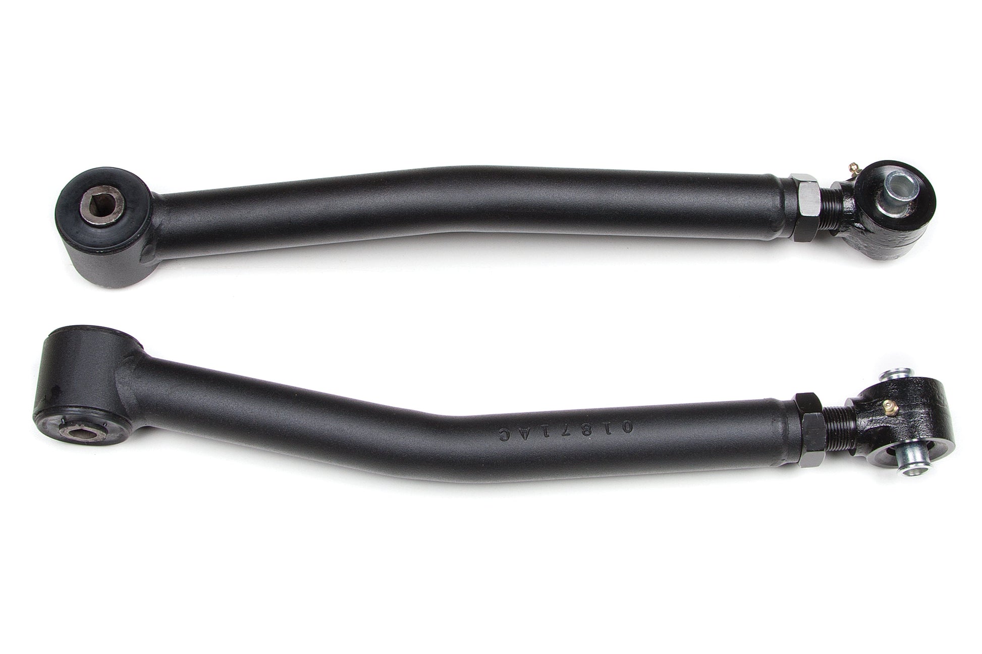 At the axle end they utilize an OE-style rubber bushing for long service-free operation and better isolation of noise, vibration, and harshness (NVH). At the frame mount they feature a large, forged flex end for strength, durability, and off-road articulation. The forged flex ends allow length adjustments to correctly position the front axle and correct caster. Capable of 15-degrees of misalignment in either direction for more flex out on the trail.