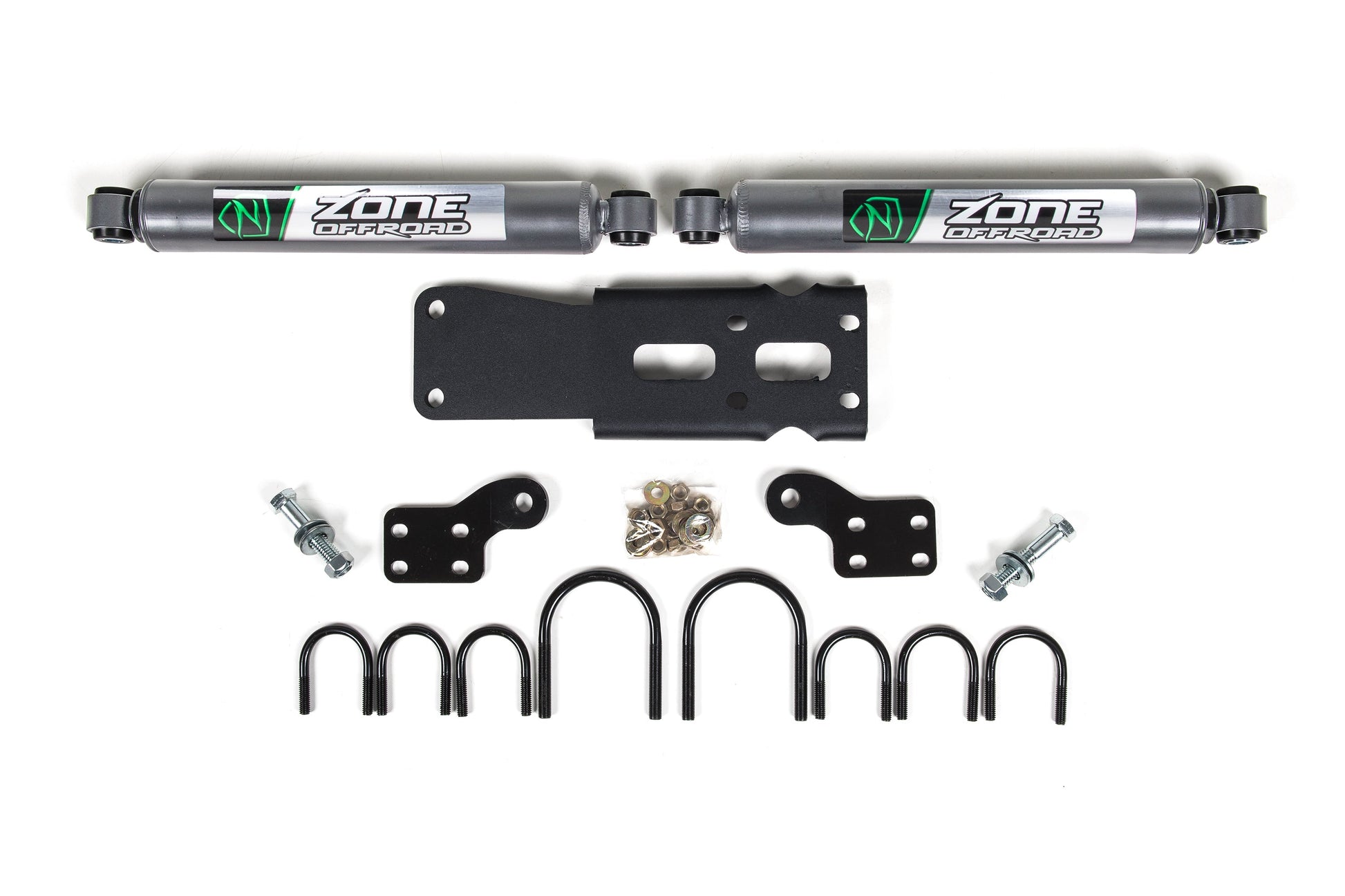 While many vehicles come equipped from the factory with a steering stabilizer, the small cylinder isn't up to the task of controlling oversized tires. Zone Offroad offers upgraded steering stabilizer options to enhance vehicle control by reducing steering shimmy and bump steer. These quality dual steering stabilizer systems are designed to improve tire wear and front end component life as well as lessen side to side motion caused by wide tires and unpredictable road conditions. Kits include cylinders, brackets and mounting hardware.