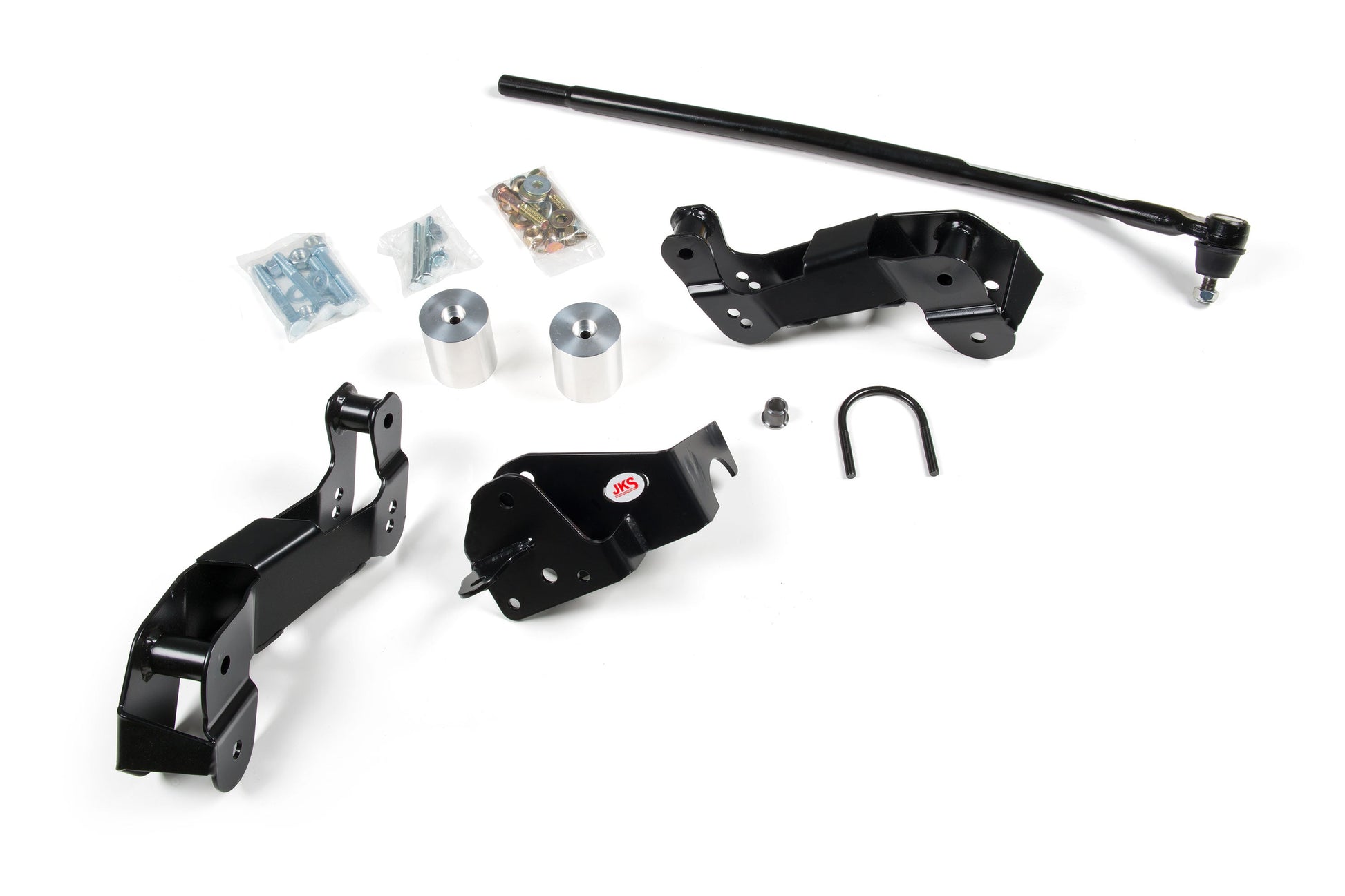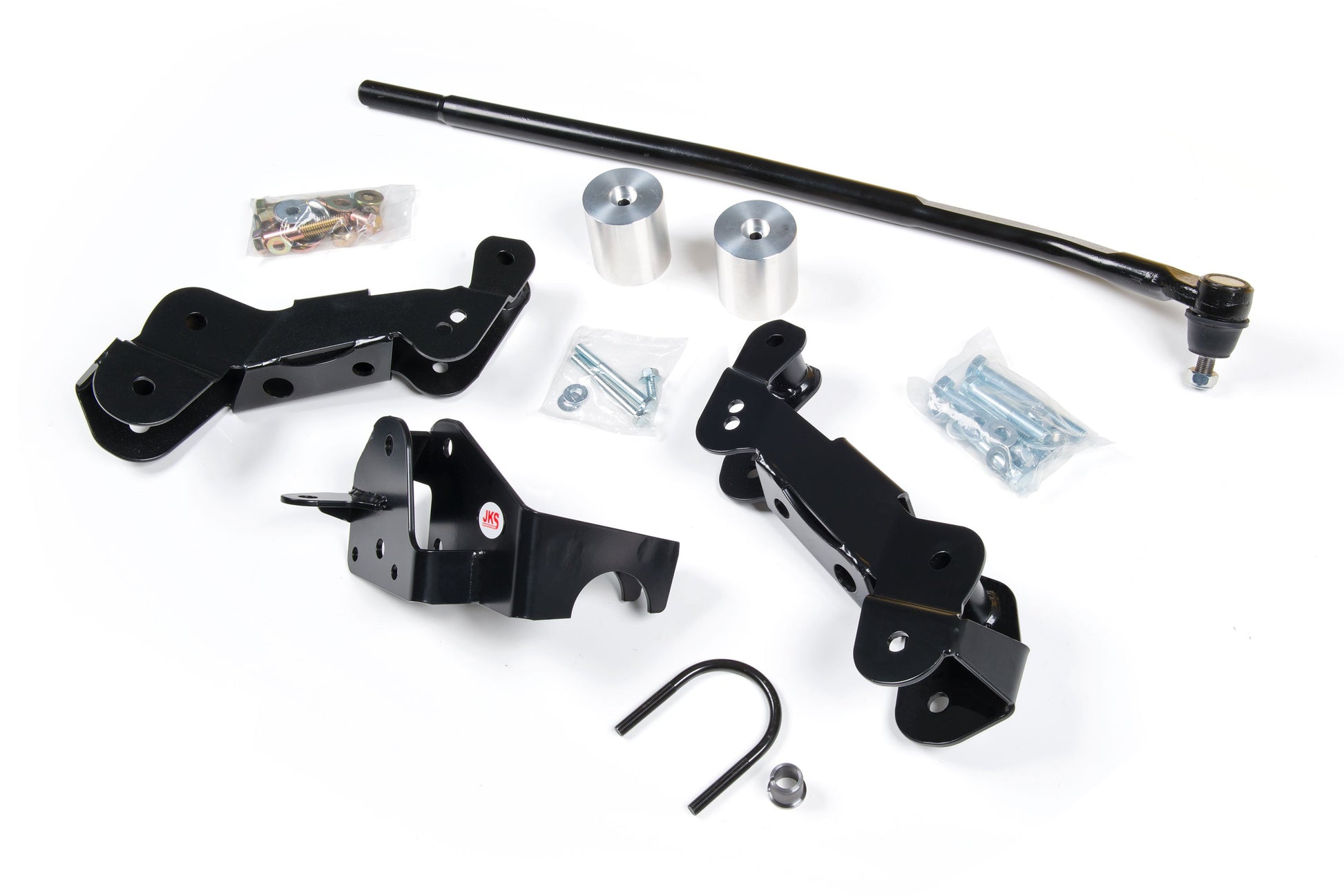Upgrade the handling of your Jeep Wrangler JK with a JKS Steering and Caster Correction Upgrade Kit. Proper geometry is important for a safe, enjoyable driving experience. You get a Drag Link Flip System plus our popular JKS6200 control arm relocation bracket system all in one kit. Works with JK lift systems of 2.5-5" of lift. The drag link flip system is comprised of a new drag link, a Track Bar bracket and a tapered steering arm insert. The design flattens out steering angles with lift heights of 2" and above. Experience better steering feel without bump steer. In order to accommodate these the flip kit, 3" tall front aluminum bump stop extensions are included to provide the proper clearance at full bump. The combination of these brackets with the high steering components create an amazing handling package. This upgrade kit can be used with several different lift systems setups. There are a few items that are required for proper fit and function of this kit in combination with other systems: You must use a factory pitman arm; the design cannot be combined with other track bar relocation systems, (although most popular adjustable track bars are ok) and you must maintain a minimum of 3" worth of bump stop extension over factory. Works with either the 2.5 or 3.5" JSpec systems. The 2" JSpec front bump stops will need to be replaced with the 3" provided in the Upgrade Kit.