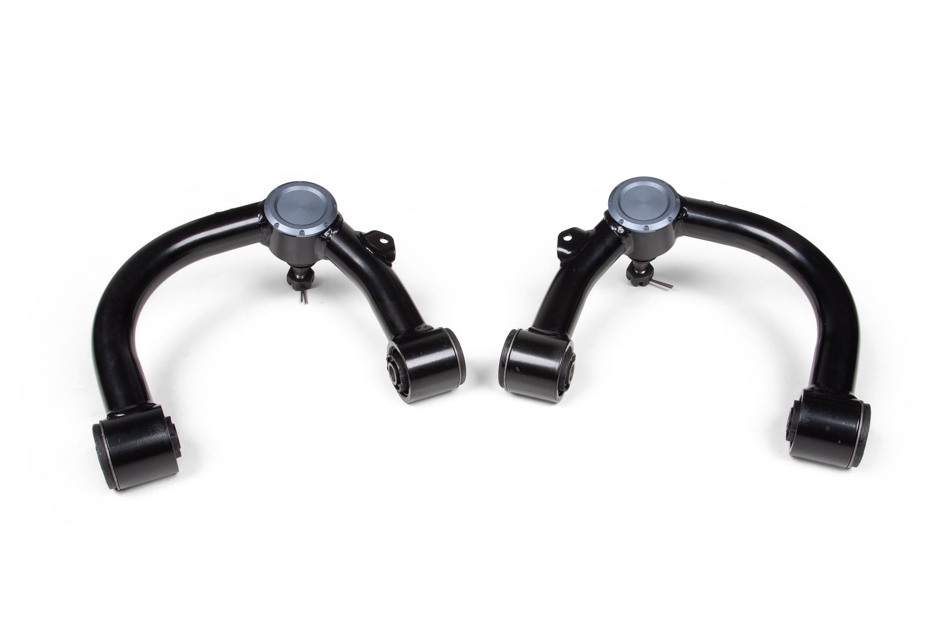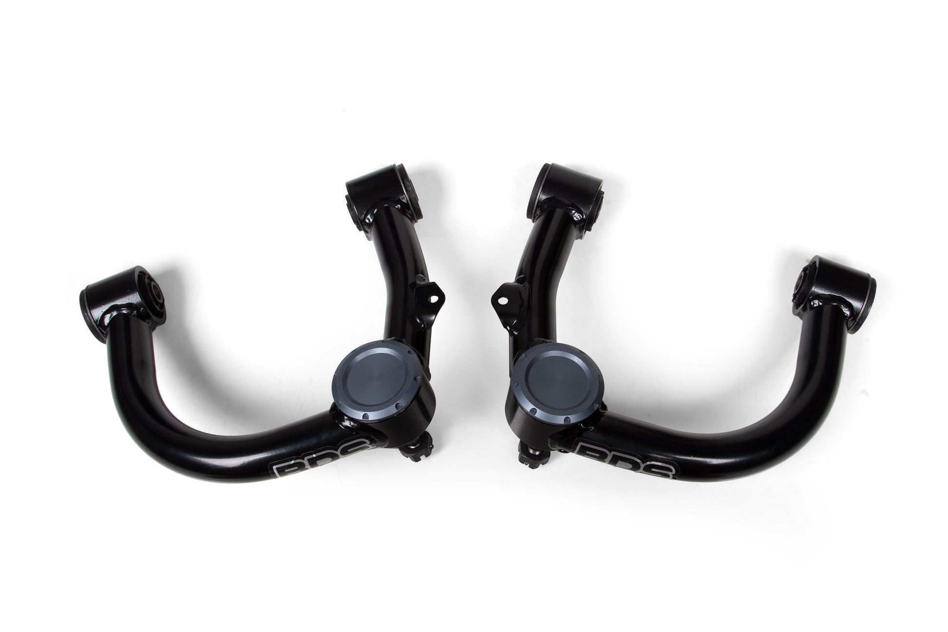 These UCAs can be used with BDS lift kits and other lift and leveling kits on the market. The frame mounting ends feature durometer-specific rubber bushings and premium quality ball joints for smooth, quiet operation, and superior durability compared to arms featuring uniballs, poly bushings or heims.